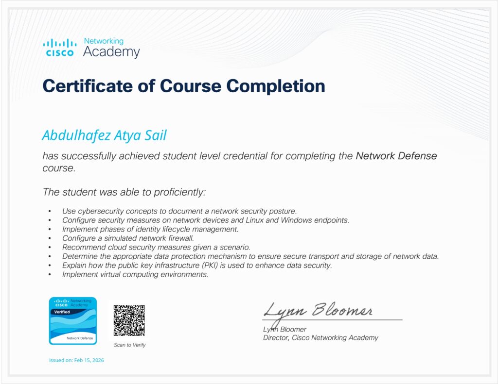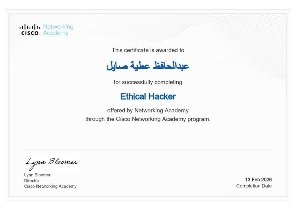 فقد نال شهادة Ethical Hacker من Cisco عبر أكاديمية سيسكو، والمتخصصة في أمن المعلومات واختبار اختراق الأنظمة لغرض تعزيز حمايتها ومعالجة الثغرات وفق منهجيات مهنية معتمدة. كما حصل على شهادة Network Defense من الجهة ذاتها، والتي ركزت على استراتيجيات حماية الشبكات وتأمين البيانات والتعامل مع التهديدات السيبرانية.