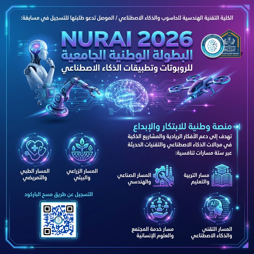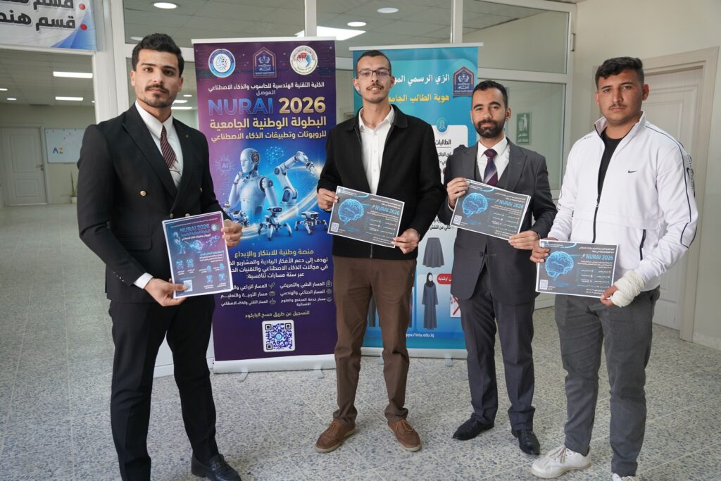 برعاية السيدة رئيس الجامعة الأستاذ الدكتورة علياء عباس علي العطار، وبإشراف السيد عميد الكلية الأستاذ المساعد الدكتور عمر إبراهيم دلال باشي، باشرت شعبة الإعلام والاتصال الحكومي في الكلية بحملة توزيع بوسترات وملصقات تعريفية بين طلبة الأقسام العلمية، وذلك بهدف تشجيعهم على المشاركة في البطولة الوطنية الجامعية للروبوتات وتطبيقات الذكاء الاصطناعي (NURAI 2026).